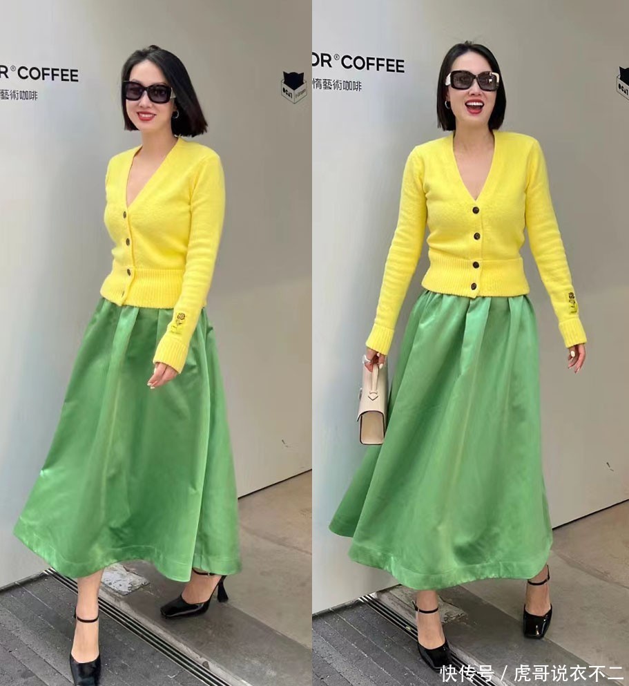 上图这位女士选拔的是撞色感搭配,应用了黄色与绿色,天然极大的提高了穿搭的辨识度,但无论关于肤色或是气质,王人有着更为严格的要求。
