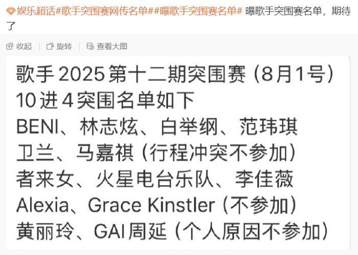 《歌手2025》行将迎来第12期节目,万众瞩目的“解围赛”,歌手们将辘集解围,争夺总决赛剩余的入场券,从网上传出的解围赛名单上看,将10进4,基本上一经笃定谁会晋级,诸位读者澳门体育澳门体育,你们若何看呢?