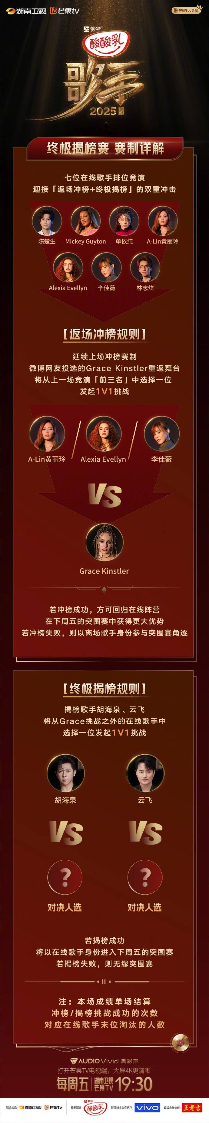 微博网友投选的「返场冲榜歌手」格瑞丝·金斯勒重返舞台,将从上一场竞演「前三名」中选择一位发起1V1挑战!